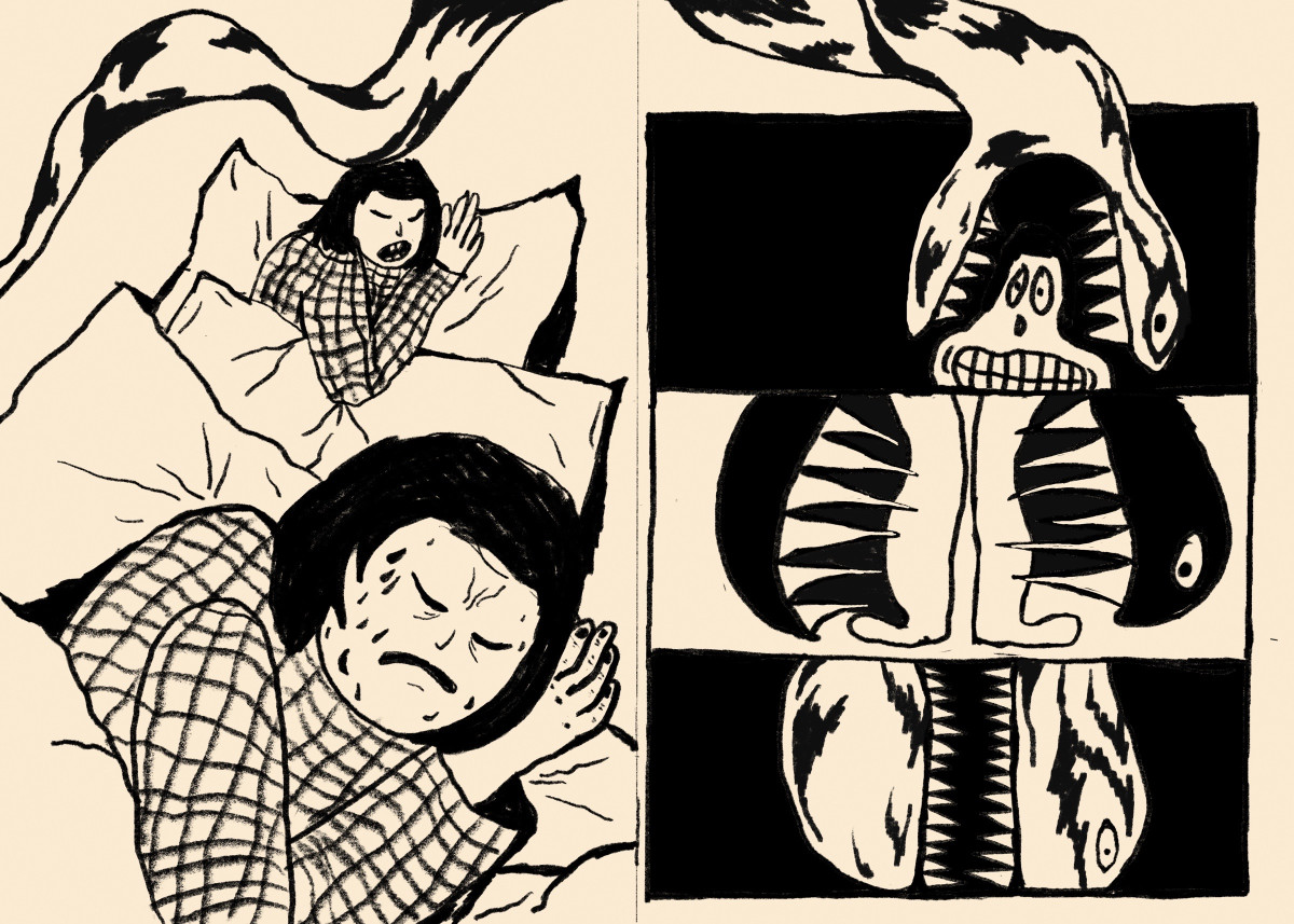 Lernens und Auflösens, durch meine Illustrationen intuitiv ausdrücken. Einerseits hoffe ich, dass ich durch den Prozess des Zeichnens ein besseres Verständnis für meine eigenen Gefühle bekomme und so besser damit leben kann. Andererseits hoffe ich auch, dass Menschen, die ebenfalls in der Angst gefangen sind, etwas Trost finden können, denn jeder ist in irgendeiner Weise von dieser Emotion betroffen. Dieses Gefühl ist nicht schrecklich, aber eine positive Einstellung zu finden, um damit umzugehen, war meine ursprüngliche Absicht, mit diesem Thema zu beginnen.