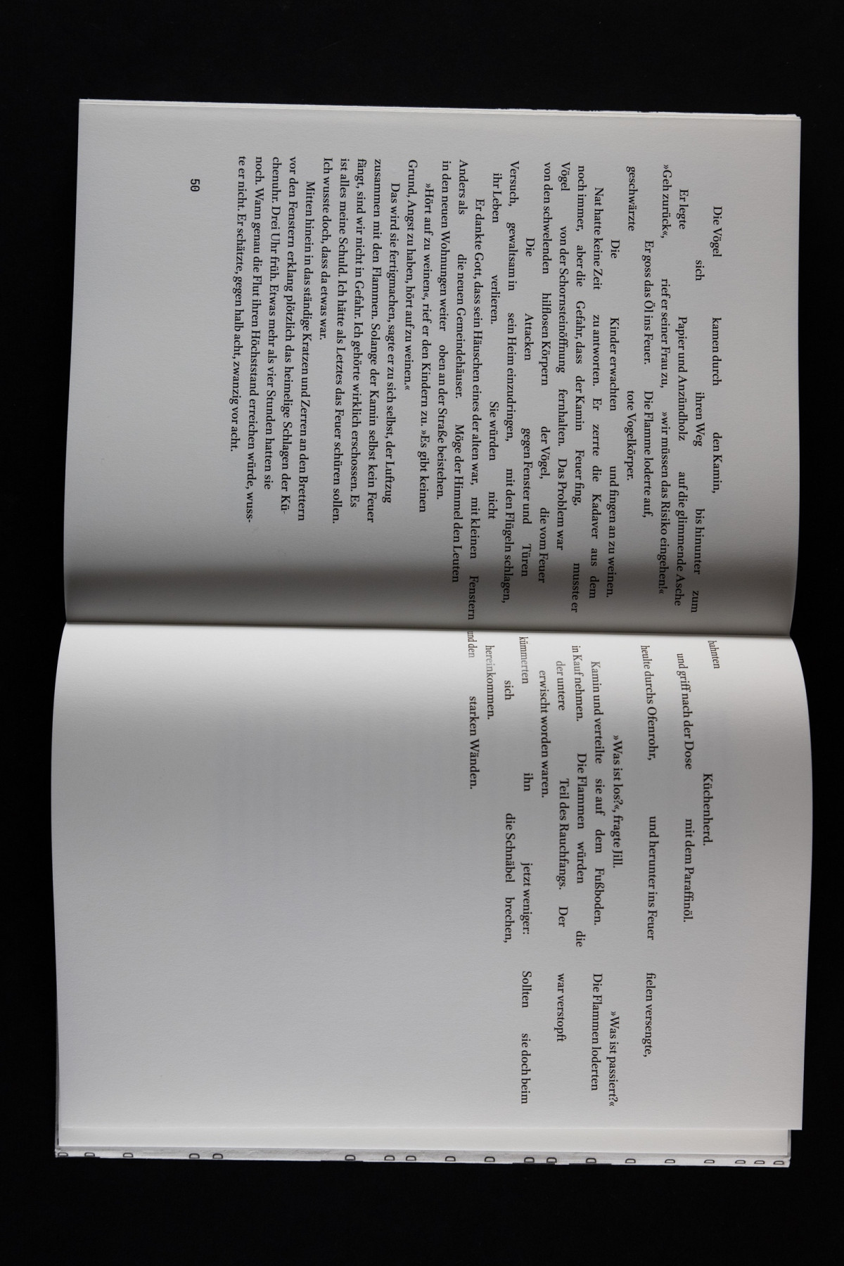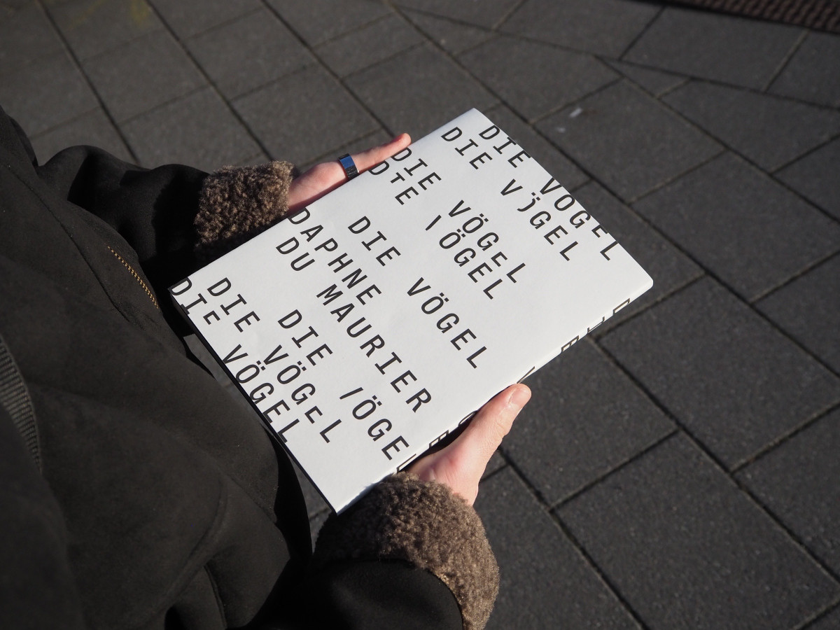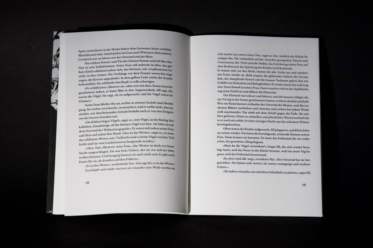 Die Neugestaltung der Novelle „Die Vögel“ von Daphne du Maurier, welche von einer von einer rätselhaften, zunehmend bedrohlichen Angriffswelle durch Vögel auf die Menschheit erzählt, thematisiert den Einbruch des Chaos in eine scheinbar geordnete Welt. Im Zentrum steht nicht die bildliche Darstellung der Vögel, sondern das Erzeugen von Unruhe und Bedrohung durch typografische Mittel. Der Text wird gestört: Wörter lösen sich aus dem Satzspiegel, Lücken reißen auf, der Blocksatz beginnt zu „flattern“. Diese typografischen Eingriffe steigern sich parallel zur Handlung und spiegeln die zunehmende Eskalation wider. Ergänzt wird die Gestaltung durch monochrome Illustrationen, die wie ein Vorspann in die Geschichte einführen – und die Plötzlichkeit der Bedrohung spürbar machen.